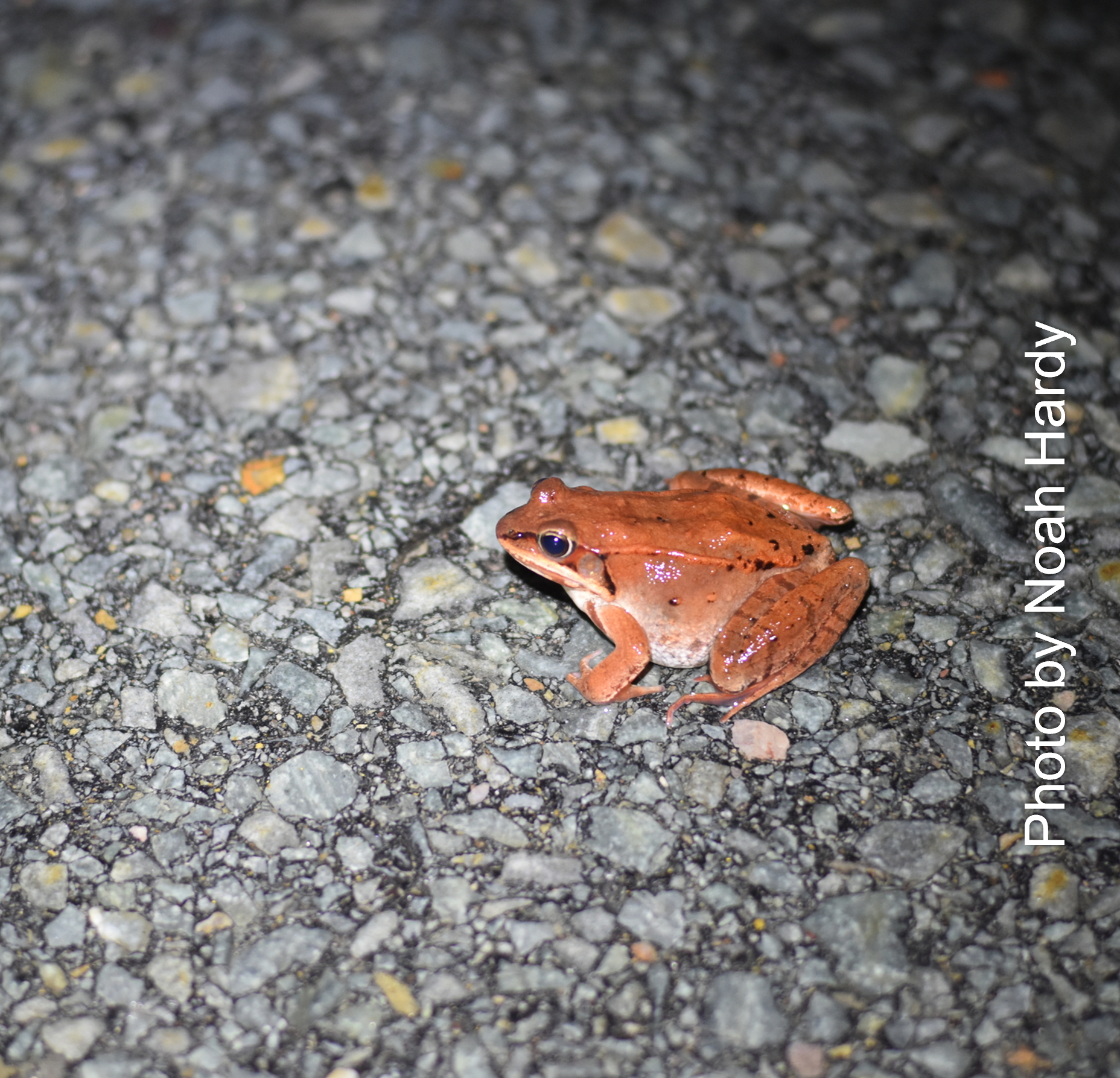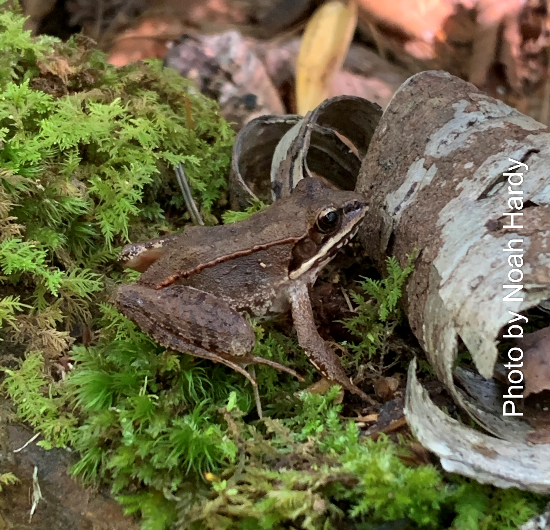 Wood frogs are typically brown or tan in color with a dark brown mask on each side of their head, behind each eye. Their lip and belly are mostly white, they have stripes on their hind legs, and can have some spotting along their body.