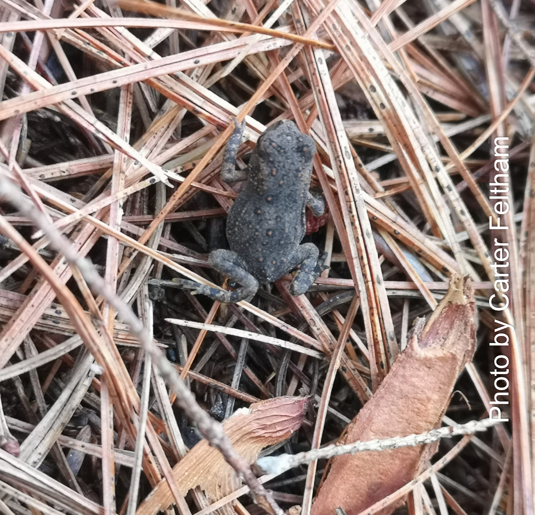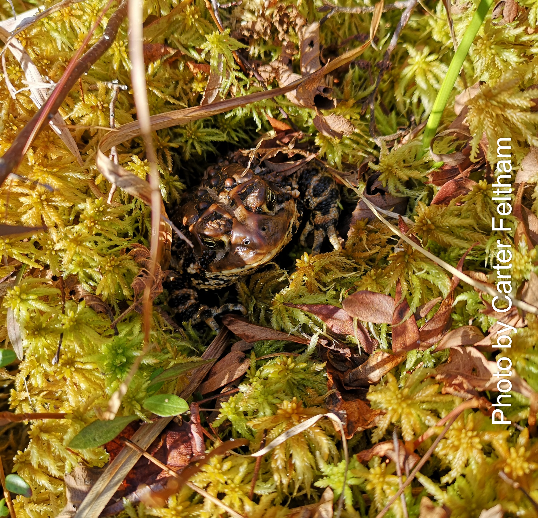 The only toad species in Nova Scotia, the Eastern American Toad displays bumpy brown, olive, or reddish skin. The bumps can be slightly reddish making them look like warts. Toads have short legs, white bellies, and slight webbing on the hind feet. Behind each eye, they have a gland that protrudes slightly. Young toads can be confused with Spring Peepers as their habitat can overlap, and the gland behind the eye may not be fully developed yet.