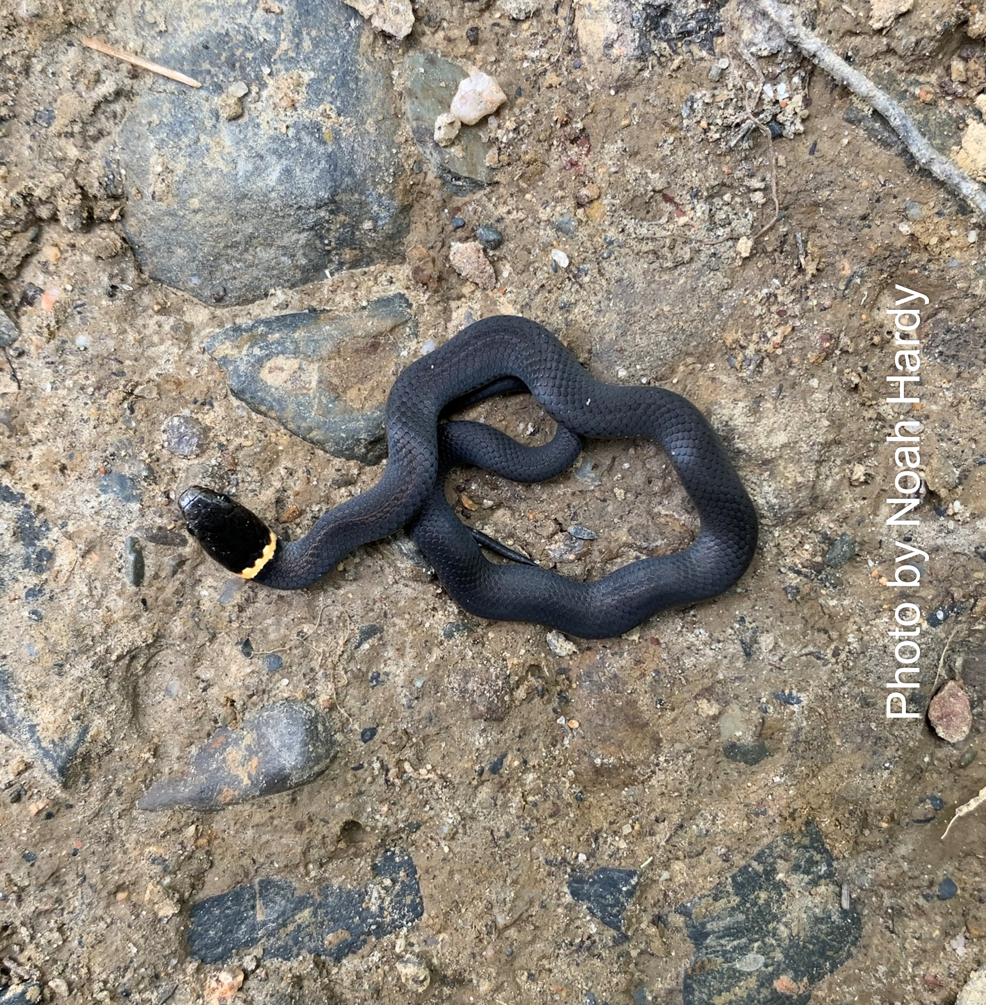 Ring-neck snakes as their name suggests, display a light-colored ring around their neck. The rest of the body presents with solid black or brown. They are nocturnal and are more likely observed in the evening. Ring-necked snakes have smooth scales. Ring-necked snakes are also 1 of the 2 species in Nova Scotia that lay eggs.
