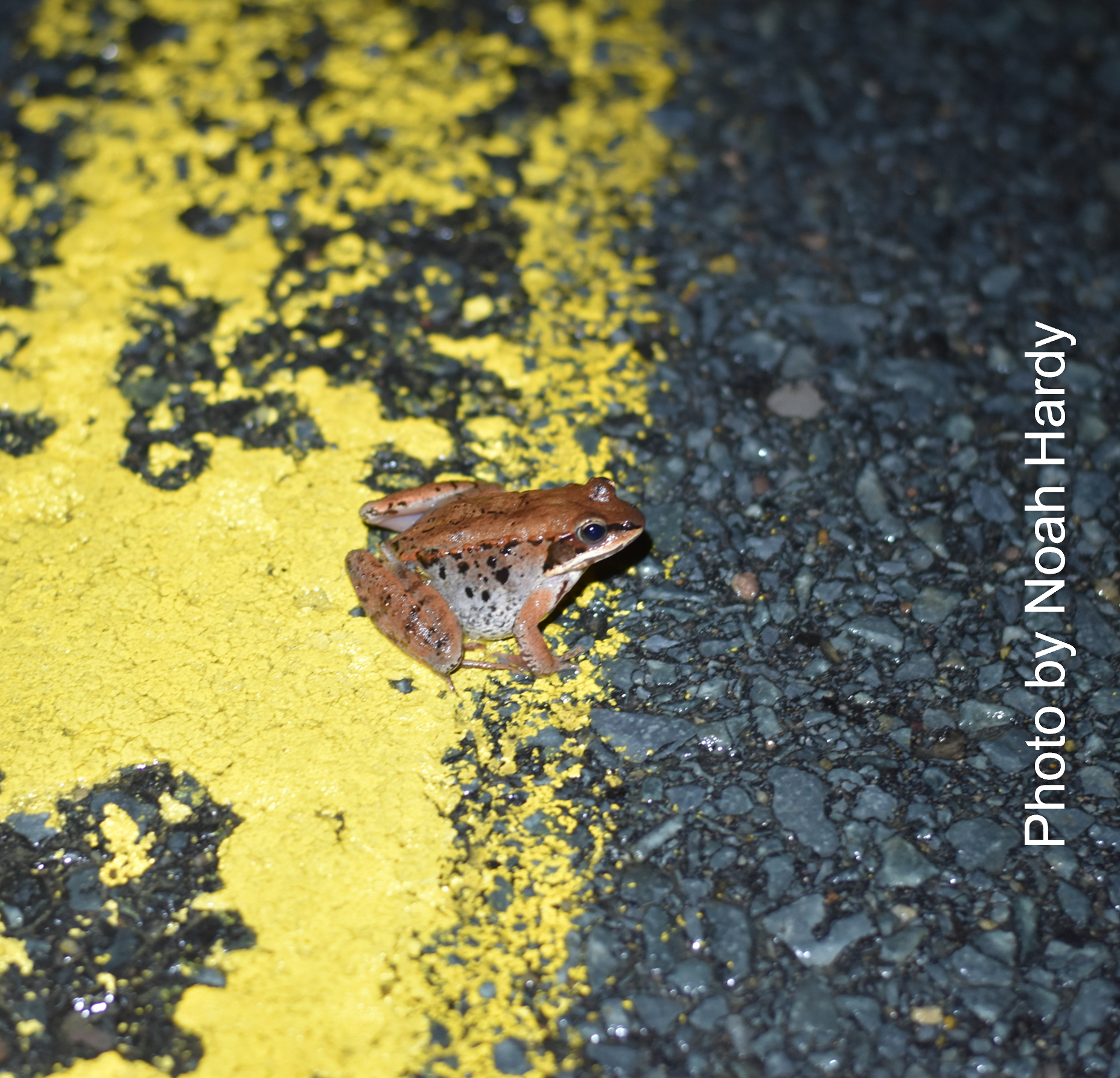 Wood frogs are typically brown or tan in color with a dark brown mask on each side of their head, behind each eye. Their lip and belly are mostly white, they have stripes on their hind legs, and can have some spotting along their body.